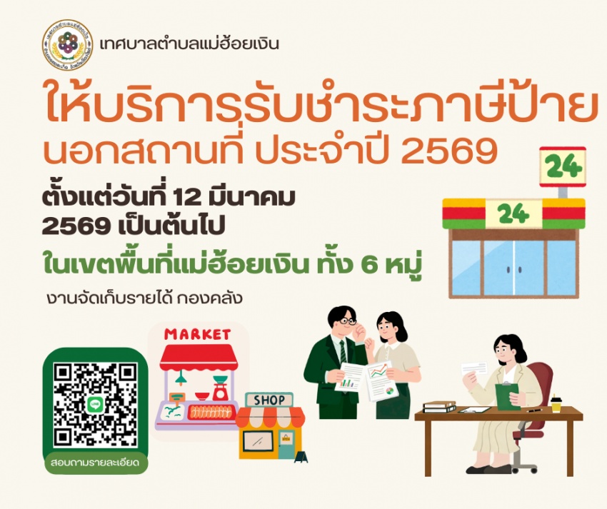 ประชาสัมพันธ์ กองคลัง เทศบาลตำบลแม่ฮ้อยเงิน จะออกให้บริการรับชำระภาษีป้ายนอกสถานที่ ประจำปีงบประมาณ พ.ศ. 2569 เพื่ออำนวยความสะดวกให้แก่ประชาชนในการชำระภาษี เริ่มให้บริการตั้งแต่วันที่ 12 มีนาคม 2569 เป็นต้นไป ณ พื้นที่ 6 หมู่บ้าน ภายในเขตเทศบาลตำบลแม่ฮ้อยเงิน