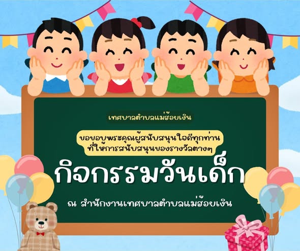 เทศบาลตำบลแม่ฮ้อยเงิน ขอขอบพระคุณหน่วยงาน ภาคเอกชน และประชาชนทุกท่าน ที่ได้ให้การสนับสนุนของขวัญและสิ่งของต่าง ๆ สำหรับกิจกรรมวันเด็กแห่งชาติ ประจำปี พ.ศ. 2569 ซึ่งการสนับสนุนในครั้งนี้มีส่วนสำคัญอย่างยิ่งในการส่งเสริมความสุข ความสร้างสรรค์ และพัฒนาการที่ดีให้แก่เด็กและเยาวชนในพื้นที่