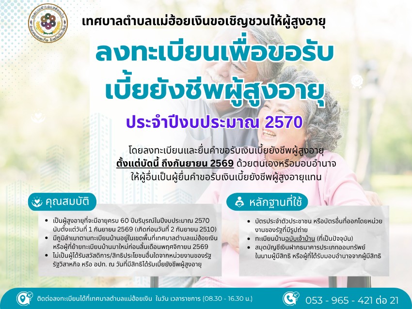 - บัญชีรายชื่อผู้มีสิทธิรับเงินเบี้ยยังชีพผู้สูงอายุและเบี้ยยังชีพคนพิการของเทศบาลตำบลแม่ฮ้อยเงิน ประจำปีงบประมาณ 2569 (02 ต.ค. 68)